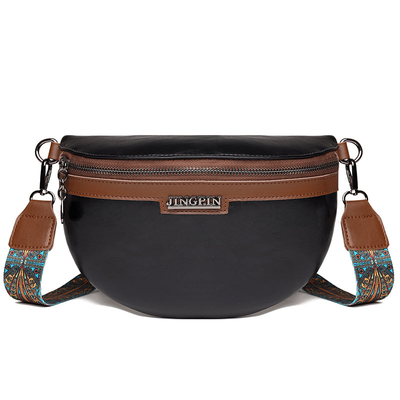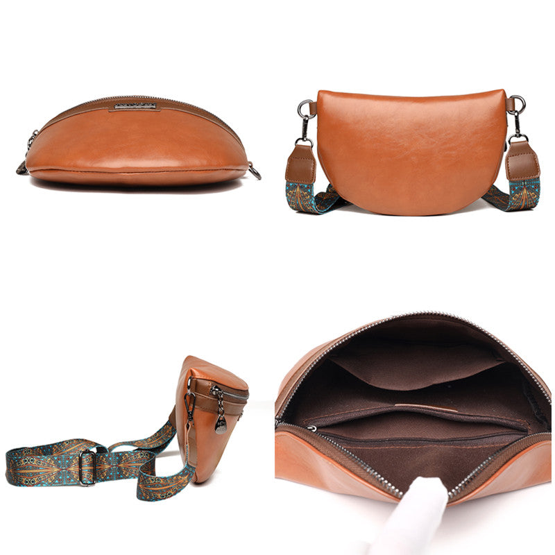 Tämän naisille tarkoitetun boheemin vyölaukun erityispiirre on sen hippikuvioinen olkahihna. Nämä omaperäiset, trendikkäät kuviot tuovat tyyliin ripauksen aitoutta ja luovat silmiinpistävän kontrastin sileän nahan kanssa.