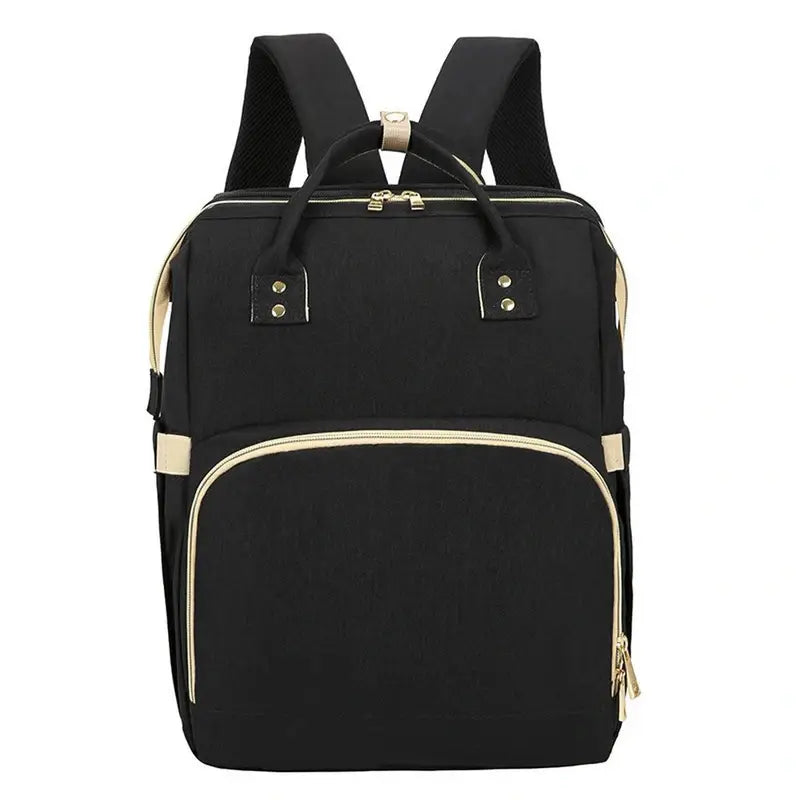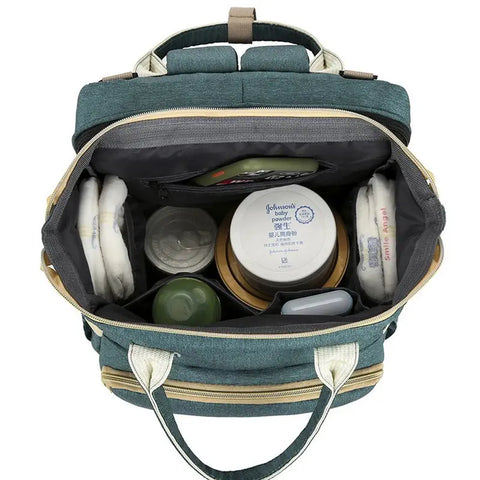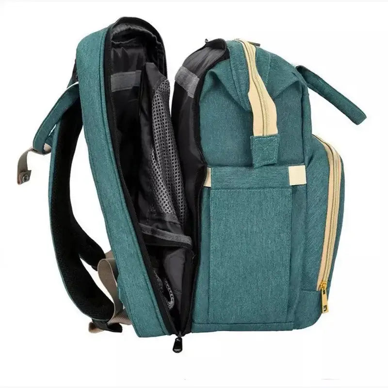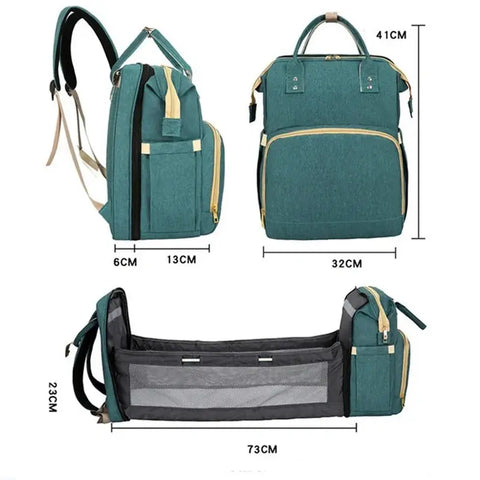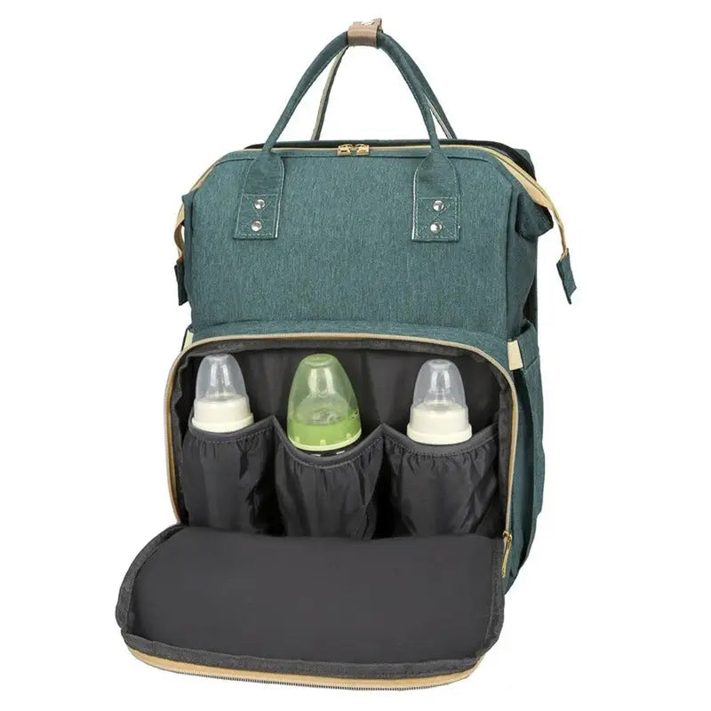 Laajennettavissa oleva hoitolaukku avautuu turvalliseksi vauvan sängyksi, joka on tuettu molemmin puolin kahdella jäykällä palkilla. Siinä on pehmustetut olkaimet optimaalista mukavuutta varten sekä kaksi vaunukiinnikkeen hihnaa ja kahvojen kiinnitys tarranauhalla. Vesitiiviinä nylonista valmistetun repun ansiosta hoitolaukku on välttämätön.
