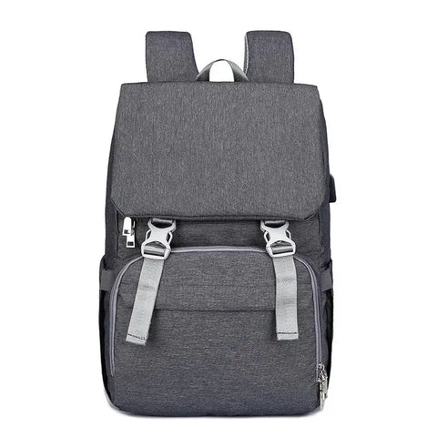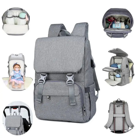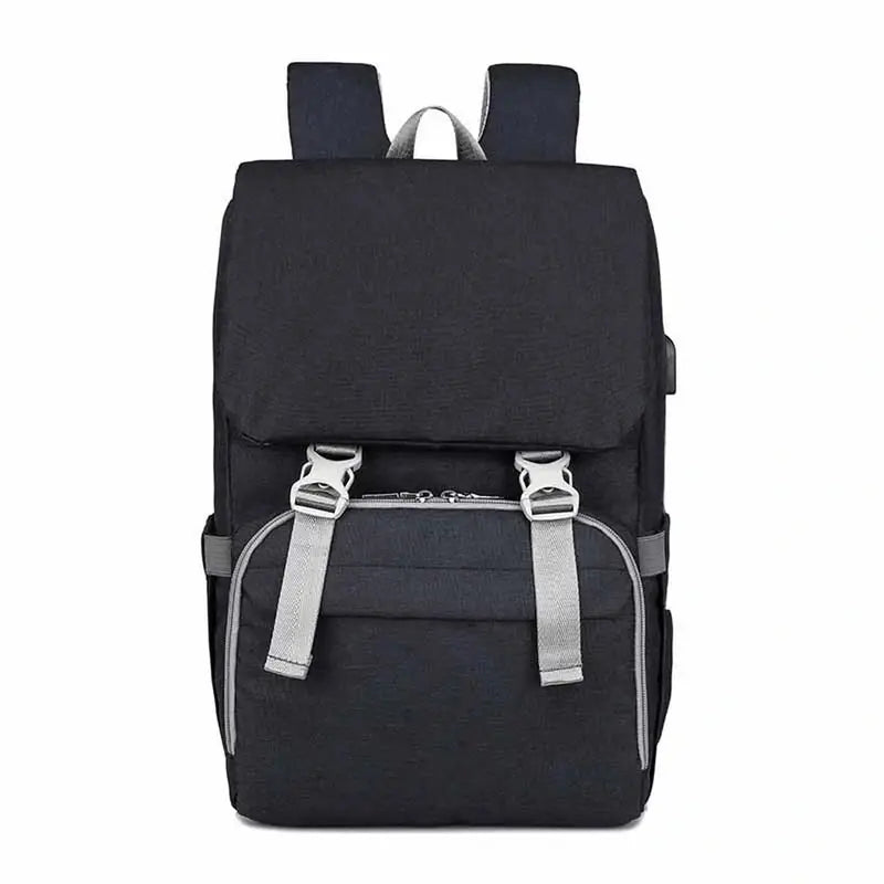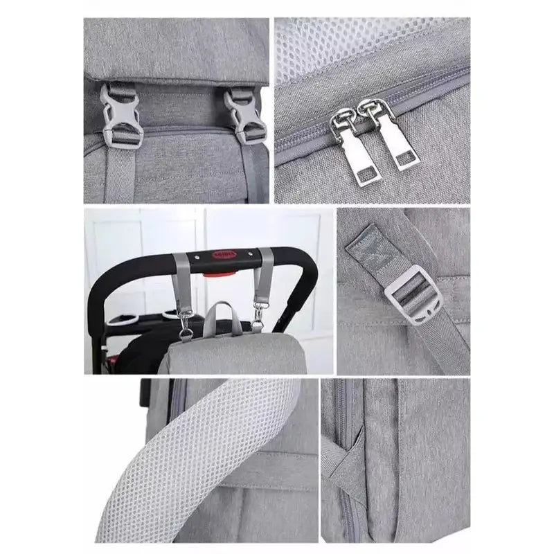 Se on erittäin kevyt ja varustettu leveillä pehmustetuilla olkahihnoilla optimaalisen kantamisen mukavuuden takaamiseksi. Siinä on suuri osasto, jossa on runsaasti säilytystilaa, sivutaskut ja etutaskut sekä takana tasku, joka laajenee vaipanvaihtoalustaksi, jotta voit hoitaa vauvaa. Laukkuun kuuluu kaksi vaunuhihnaa ja USB-portti, jotta voit ladata puhelimesi missä tahansa.