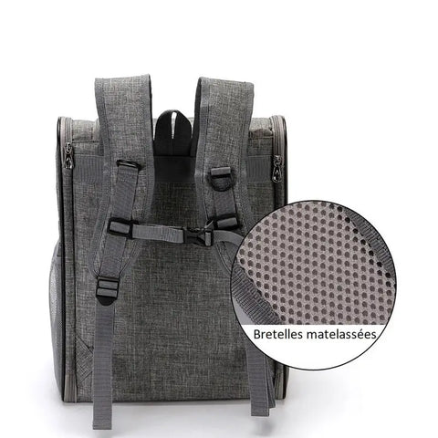 20L kapasiteetillaan se voi kantaa jopa 8kg painon. Siinä on kolme suurta ilmanvaihtoa tarjoavaa ritilää, jotka tuulettavat repun sisätilaa ja siinä on mukava tukilevy sekä pieni sisäinen hihna lemmikkisi kiinnittämiseksi, jotta se ei pääse karkaamaan avattaessa.