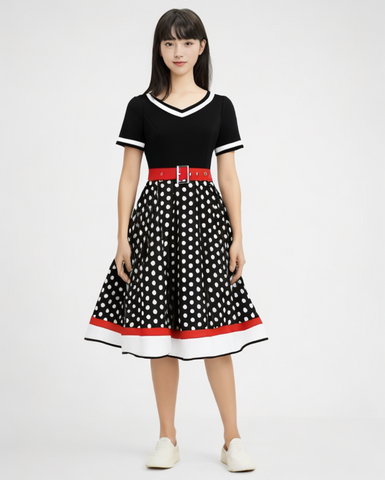 Tämä musta pilkullinen pin up -mekko on suunniteltu vintage-tyylistä pitäville naisille.