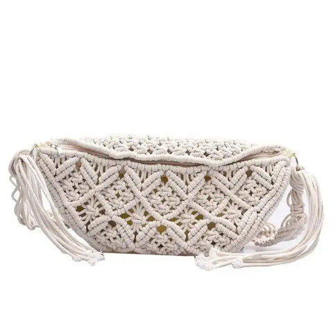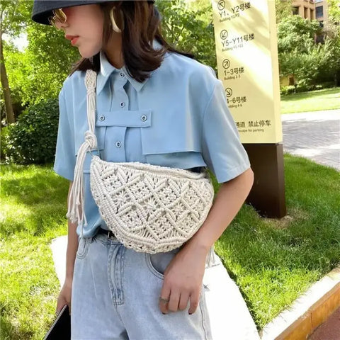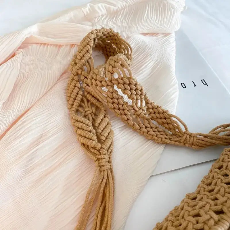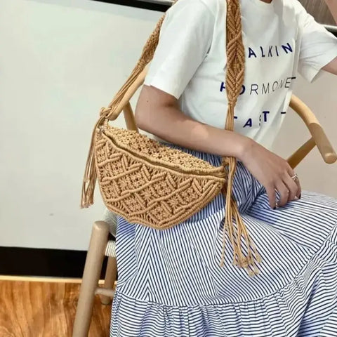 Tämä naisten vyölaukku on käsintehty puuvillalangasta, mikä antaa sille trendikkään, kudotun ilmeen. Se on niiden naisten suosikki, jotka haluavat luonnollisen, selkeän ilmeen. Tämä asuste sopii niille, jotka etsivät tyylikästä, rentoa ja toimivaa vyölaukkua. Se sopii täydellisesti lisäämään boheemia tyyliä kesäasuihisi ja pitämään välttämättömät tavarat lähellä.