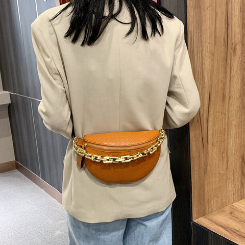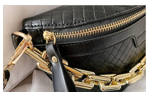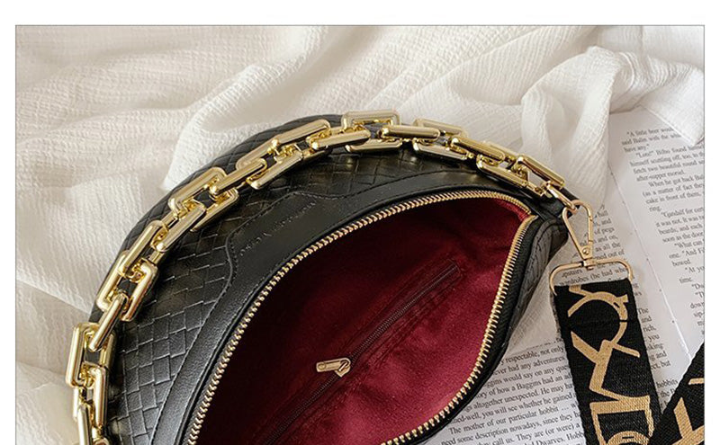 Tämä naisten vyölaukku, jossa on ketju, on täydellinen tasapaino hienostuneen tyylin ja toiminnallisuuden välillä, mikä tekee siitä täydellisen lisävarusteen mihin tahansa tilaisuuteen. Sen tyylikäs muotoilu, jossa on siistit tikkaukset ja laskostetut koriste-elementit, tekee siitä todellisen muotihinnan.
