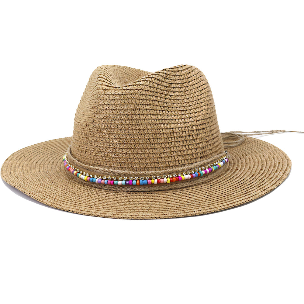 Panamahattu, joka on varustettu koristeellisella, monivärisistä helmistä valmistetulla päänauhalla, joka on irrotettava haluamallasi tavalla. Tästä hatusta kehittyvä muotiasusteena. Koska se voi muuttua mielikuvituksellisesta ulkonäöstä neutraalimpaan, tämä hattu kulkee mukanasi kaikkialla tammikuusta joulukuuhun hämmentävän helposti .