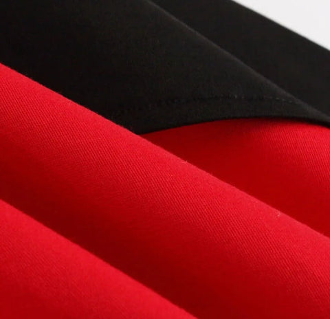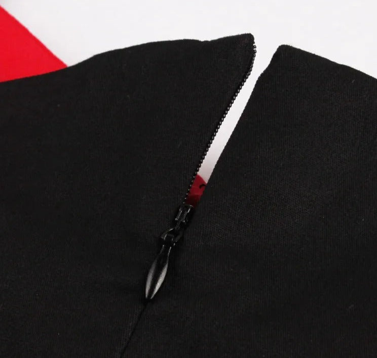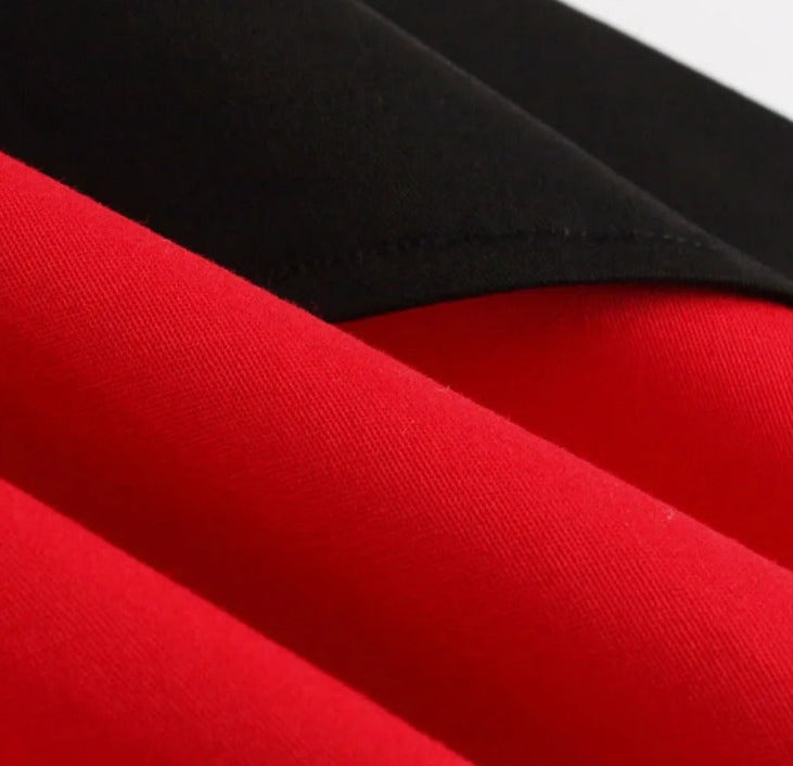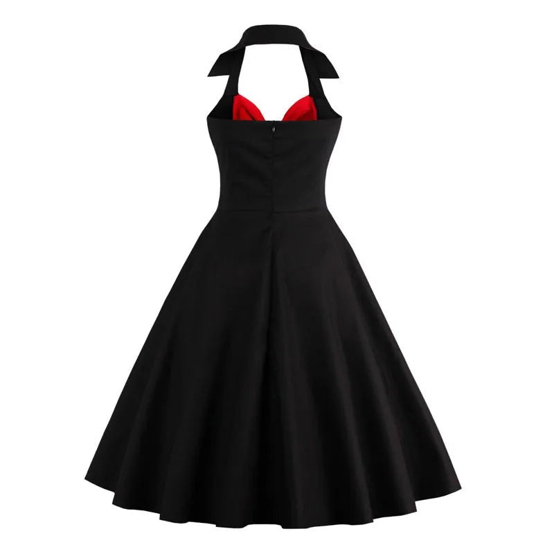 Haluatko pukeutua kauniiseen puna-mustaan rockabilly-tyyliin dekolteen mekkoon?