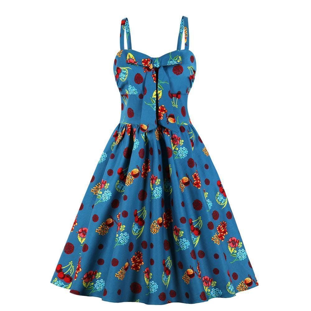 Tässä on kaunis hedelmäkuvioinen mekko! Ihanteellinen houkuttelemaan vitamiininnälkäisiä miehiä! Ole houkutteleva ja kevytmielinen tässä pin-up-kesäasussa. Korosta vartaloasi tämän mekon leikkauksen ja kapean vyötärön avulla. Kokeile jo nyt tulevaa sinistä pin-up mekkoasi.