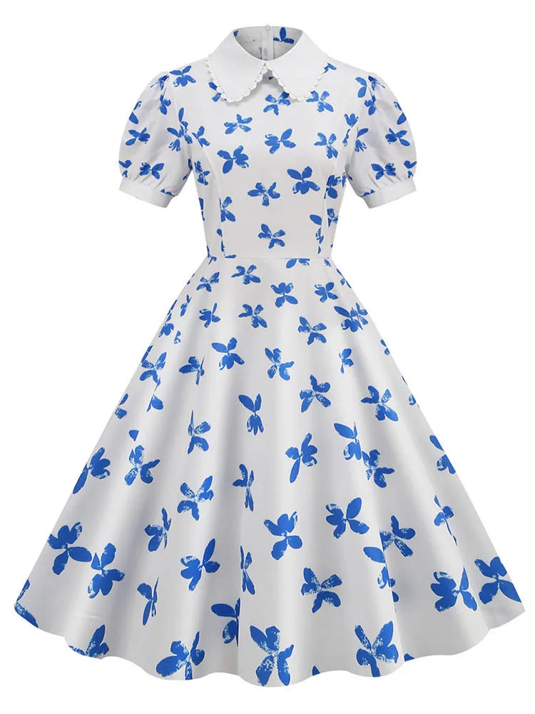 Hurmaa tässä valkoisessa pin up -mekossa sinisillä kuviolla