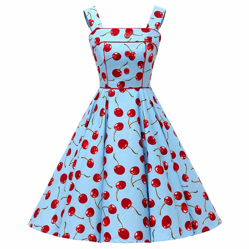 Tämä naisten kirsikkakuvioinen pin up -mekko on pin up -tyylin ehdoton klassikko. Käytä sitä kauniina päivinä ja omaksu seksikäs retrolook. Tunne olosi raikkaaksi ja kevyeksi tässä pin up -asussa